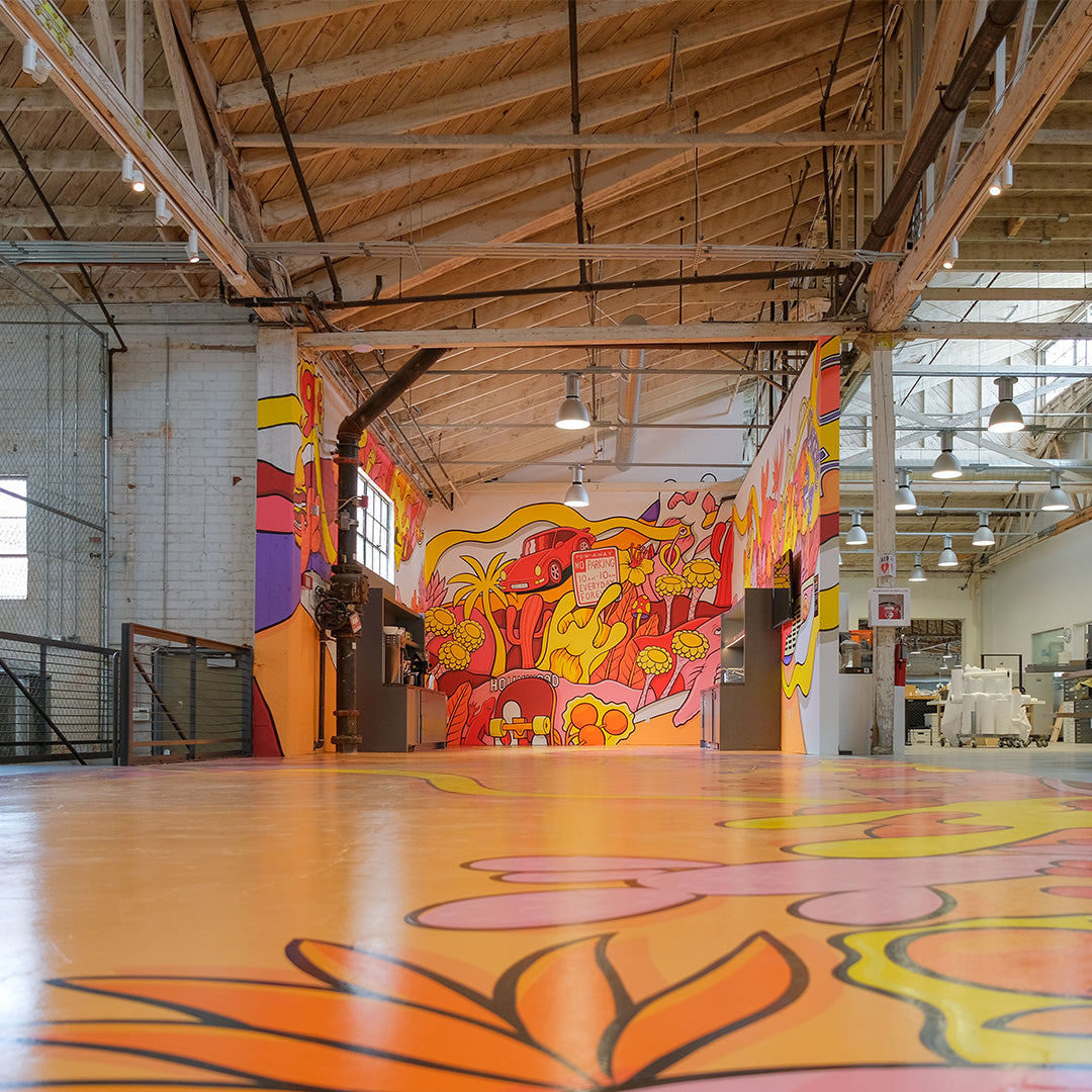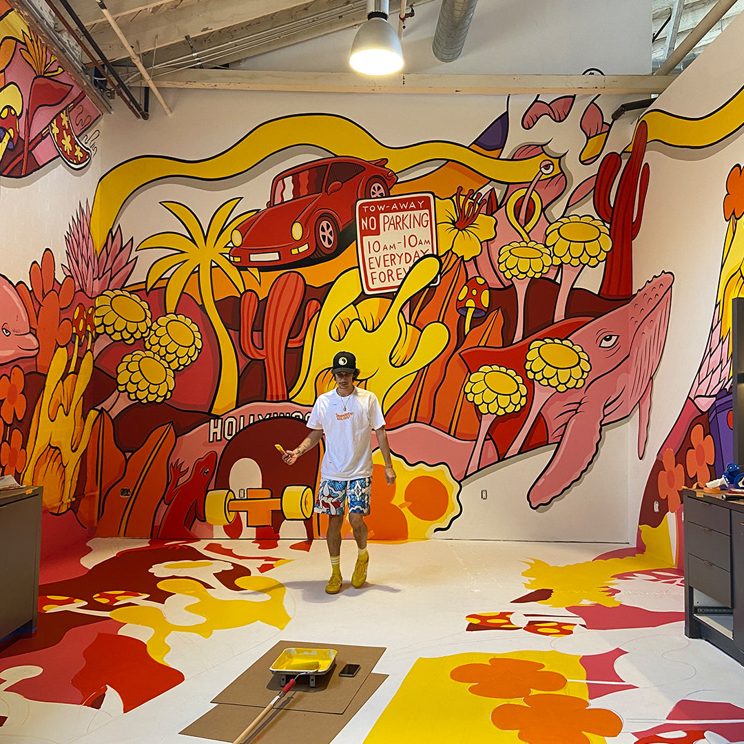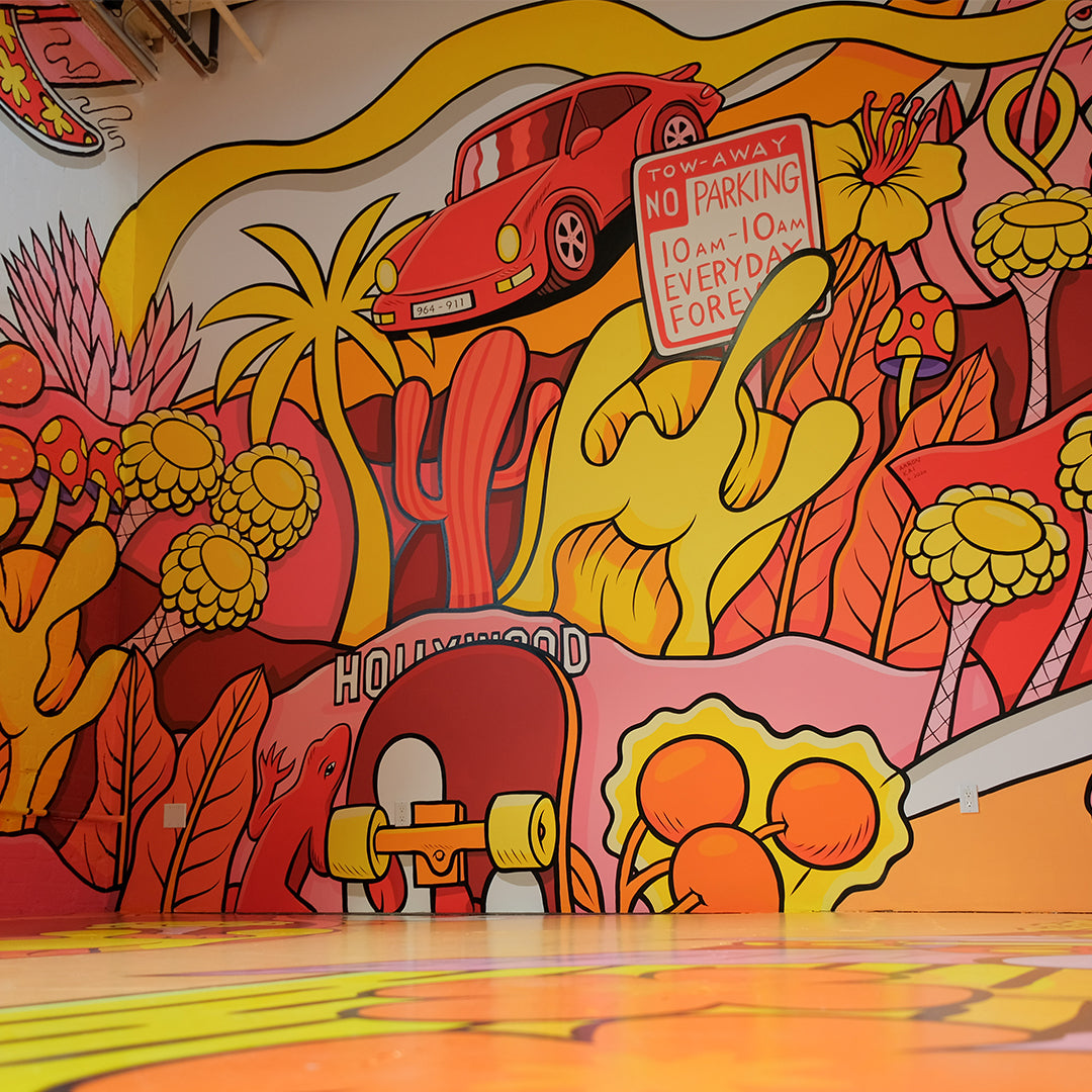 The "Mural" mug is our first collaboration with Los Angeles artist Aaron Kai. Aaron is known around the world for his apparel, prints, and colorful, large-scale murals inspired by pop culture and childhood memories of surfing in his native Hilo, Hawai’i. This design, highlighting cultural landmarks of Los Angeles, was originally created for a mural he painted at our LA studio.