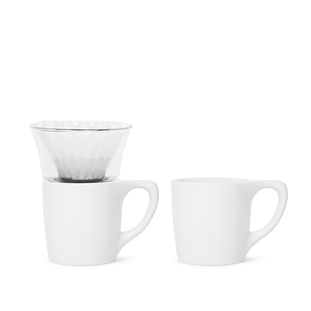A complete set to brew coffee for two: two Lino mugs, a Gino dripper, and a pack of 90 Gino coffee filters.