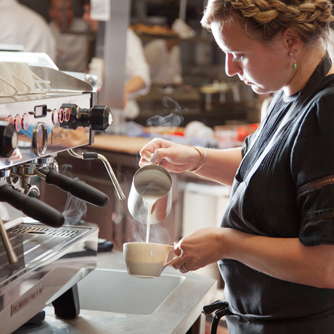 Fina was originally designed for Canlis, the iconic Seattle fine-dining restaurant lauded for its sophisticated approach to coffee service. The collection, consisting of espresso, cappuccino, and latte cup and saucer sets, maintains the same defining features as its predecessor, Lino. The curved interior creates the optimal fluid dynamics for pouring latte art, the thick base provides thermal insulation, and the flat, ergonomic handle ensures comfort and control for barista and drinker alike. The cups are made from ivory-hued porcelain, a material that replicates the delicate look and feel of bone china without sacrificing durability. The shape is refined to fit seamlessly in the most elegant place settings.